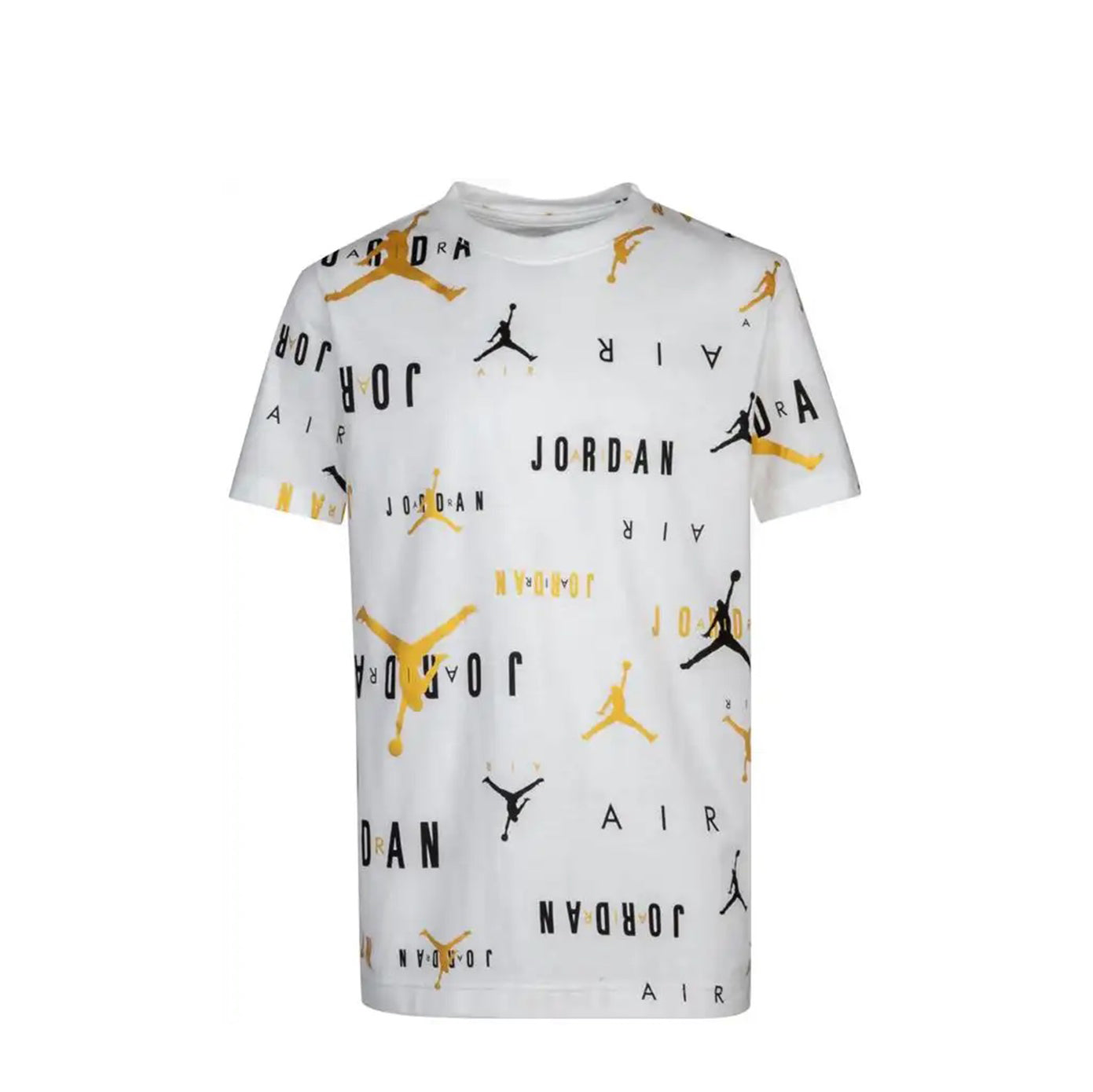 Mit einer klassischen Crew geschnitten, die Nike T-Shirt ist mit dem berühmten Logo bestreut und geschrieben Air Jordan, mit goldenem und schwarzem Kontrast.