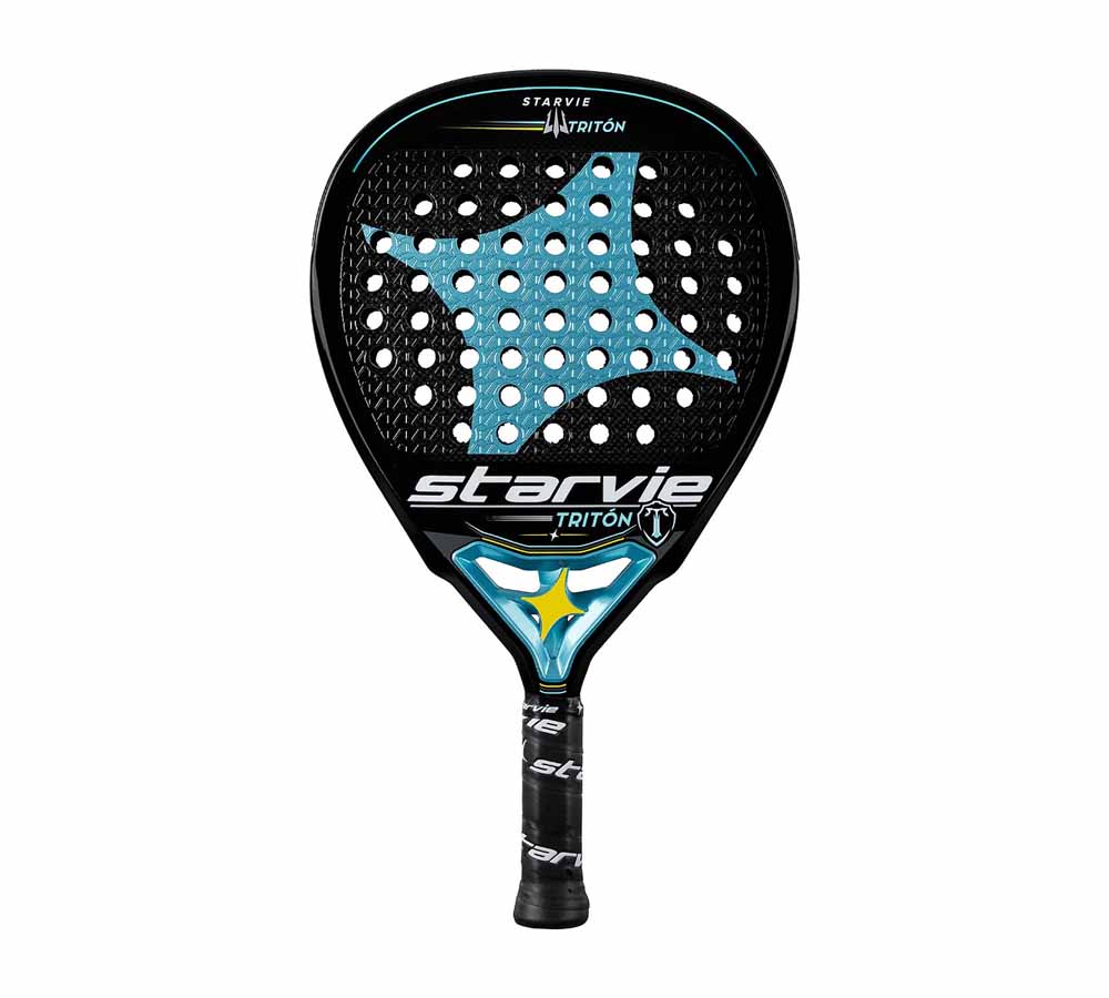 Dort Padchetta Padel Starvie TritonMit einer tränenförmigen Form hat es die Manschette um 1 cm länger. Der weiche Gummi verleiht dem Ball eine größere Geschwindigkeit. Der SternbalanceBietet auf der Klinge Gleichgewicht und Kontrolle.
