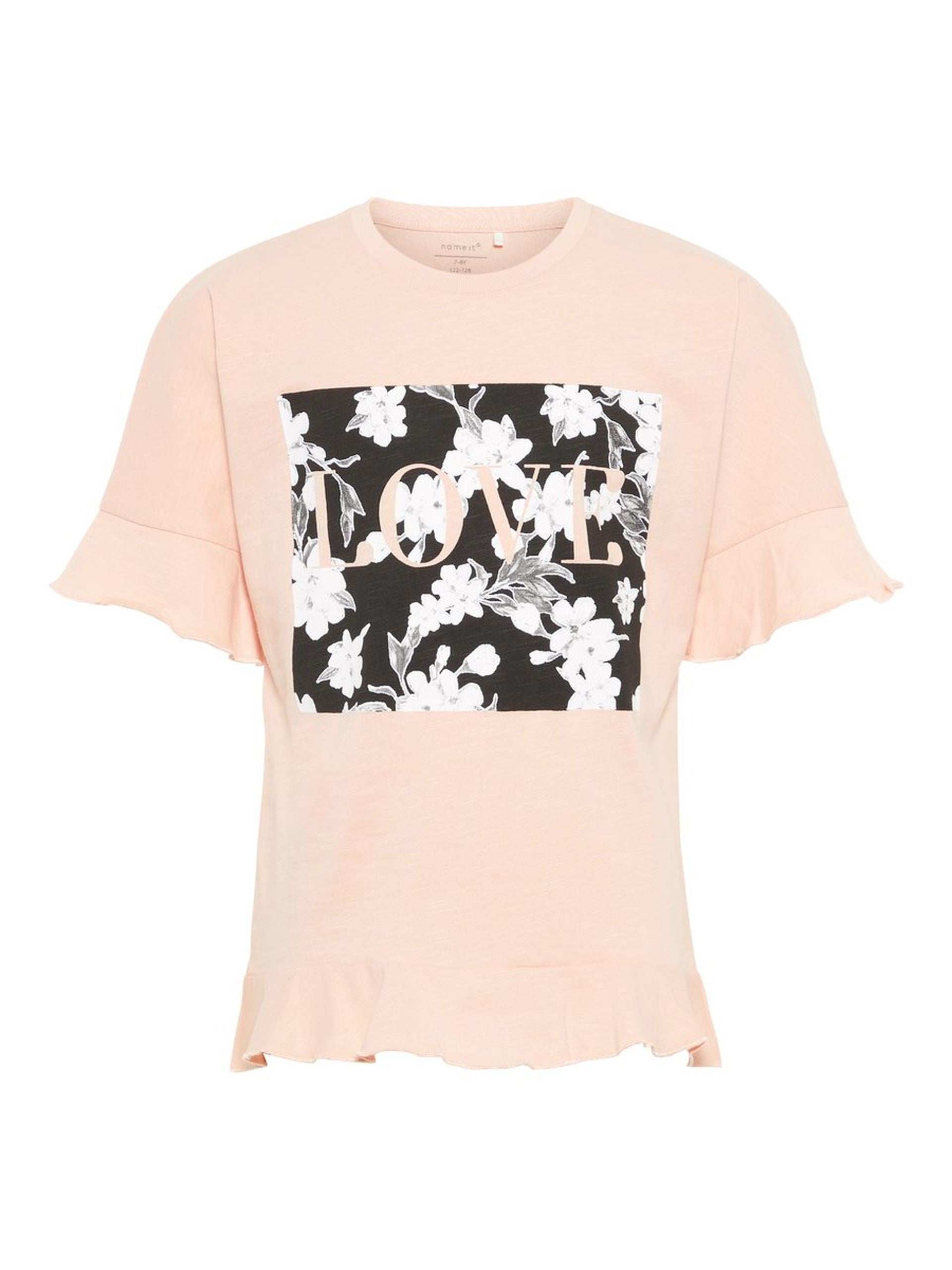 With curled edge and flies sleeves, the Name IT Filipa shirt, has a floral print in the center.