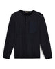 Dettagli: rinforzi su gomiti e tasca, colletto e polsini stile Henley a basso profilo