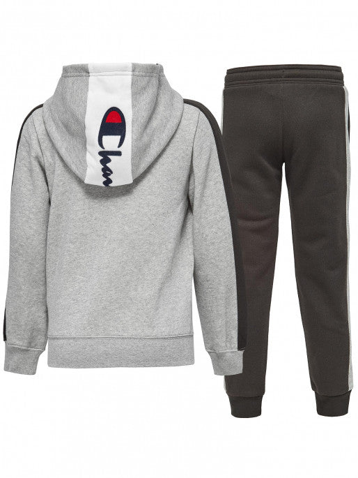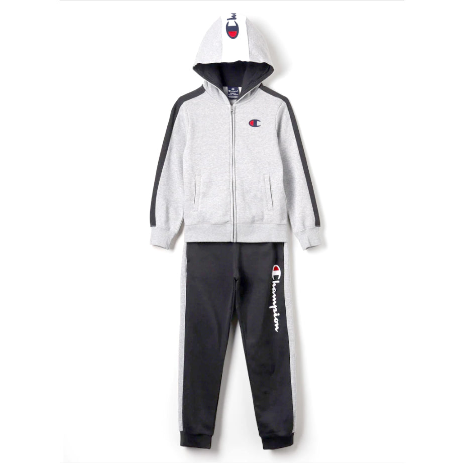 Compuesto por una sudadera con cremallera zull con detalles elásticos sobre los puños y pantalones con vida elástica con cordón, el Traje deportivo cuando era niño Tiene un gráfico moderno caracterizados por el campeón de escritura en el capó de la sudadera y a lo largo de la pierna.