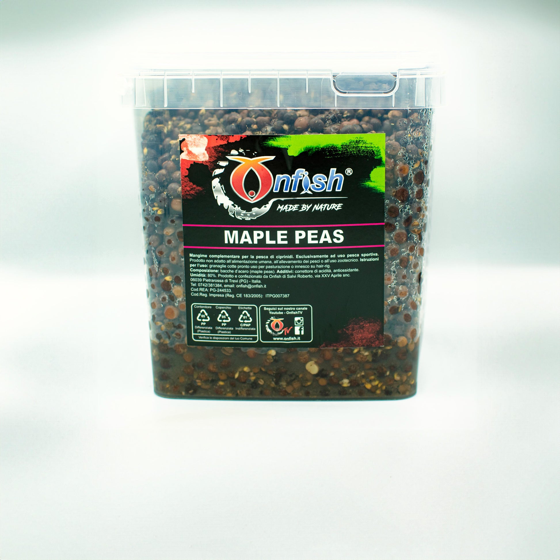 Il Secchiello Bacche d' acero di Onfish contiene granaglie indicate per gli Amur, dolci e veloci ad entrare in pesca, ideali per il carp fishing e feeder.